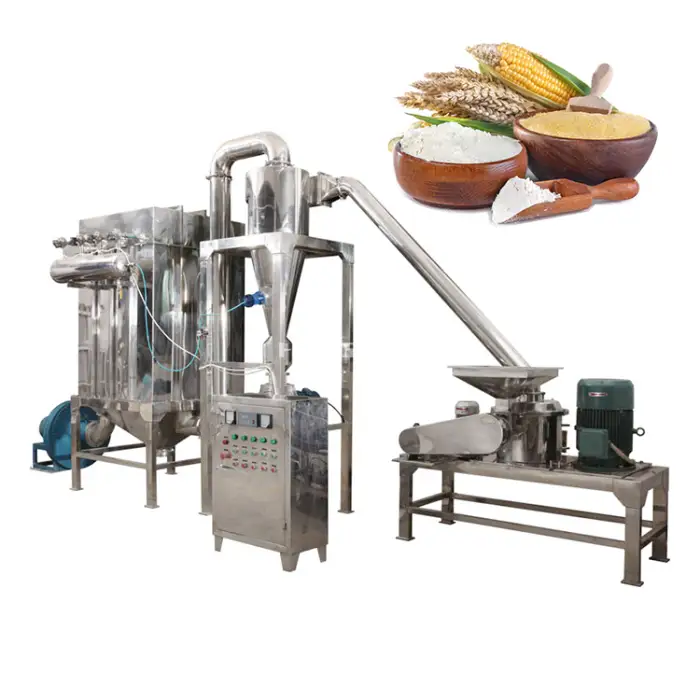 This machine is designed to grind various materials including food items like wheat and maize, as well as chemicals and plastics.