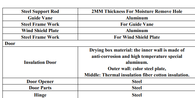 The drying room is constructed with aluminum on the inside, insulated with 100 mm thick rock wool, and covered with a color plate on the outside, or as per customer specifications.
