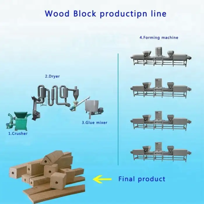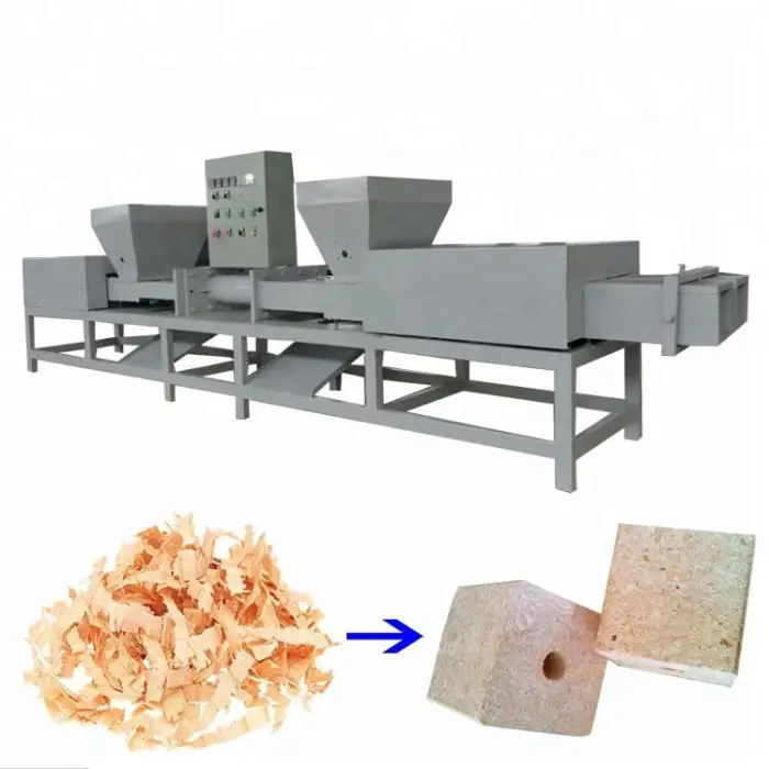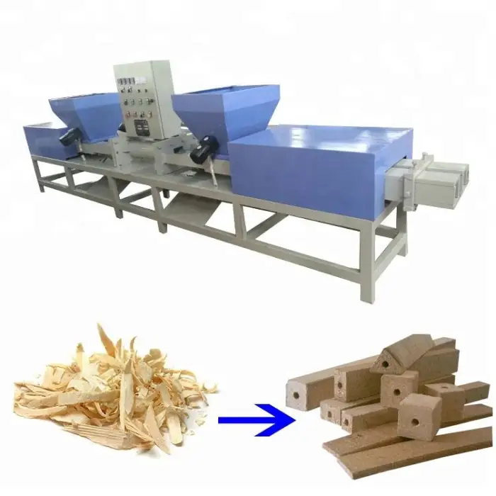 The machine is designed to utilize wood waste as raw material for producing compressed wood blocks.