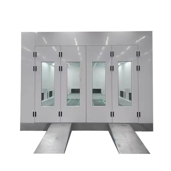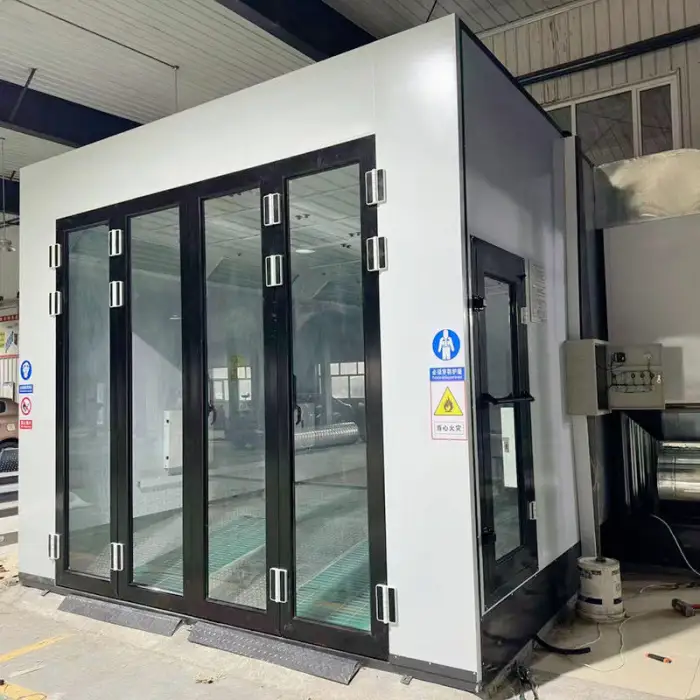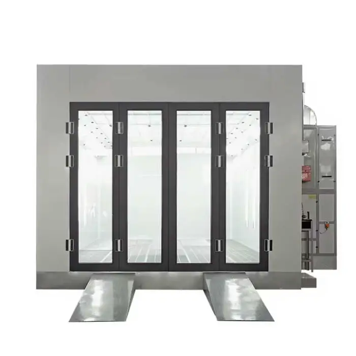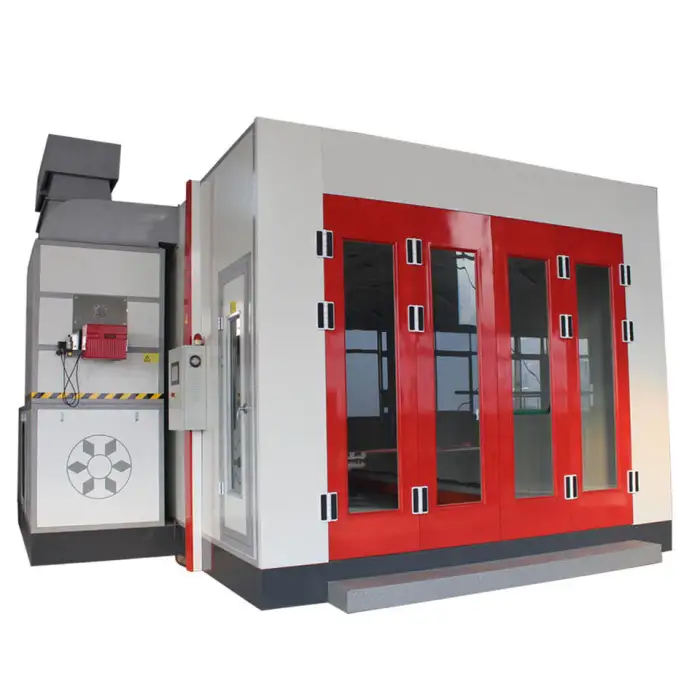 The spray booth features efficient electric heating lamps for quick drying and optimal baking of paint finishes.