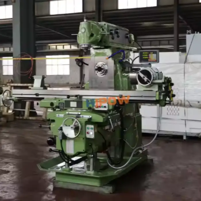 Key features include heavy-duty construction, automatic vertical milling, high rigidity for precision, versatile spindle speeds, and a large work table.