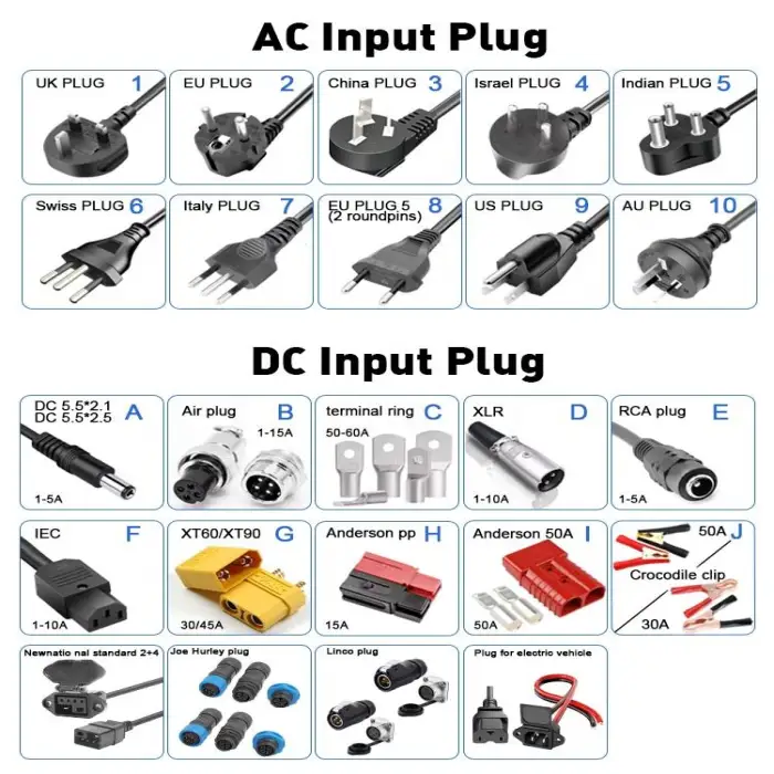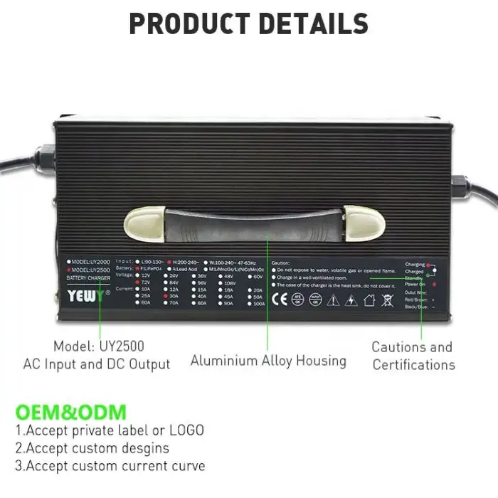 The YEWY UY2500 offers multiple output voltage options, including 12V, 24V, 36V, 48V, 60V, 72V, 84V, 96V, 108V, and 120V. Select the voltage that corresponds to your vehicle or equipment's specifications.