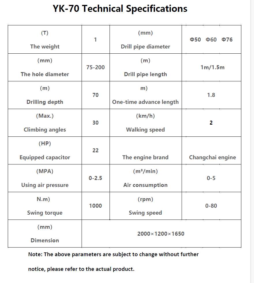 The YK-70 Drill Rig has dimensions of approximately 3.5m x 1.5m x 2.0m and weighs around 1,200 kg.