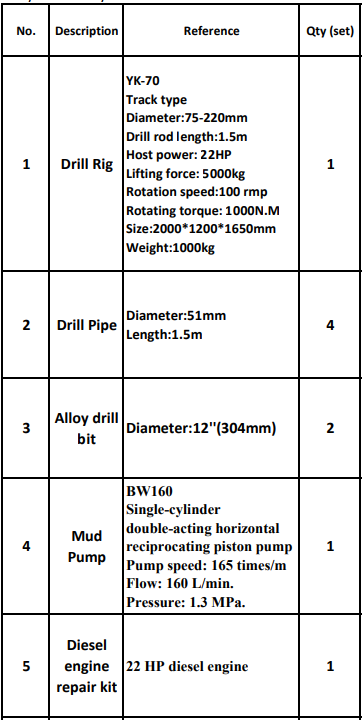The YK-70 Drill Rig package includes the drill rig itself, drill pipe, an alloy bit, and a diesel engine repair kit.
