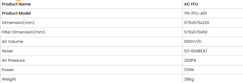 The HEPA filter in the YN-FFU-A01 can achieve efficiencies of up to 99.99995% for particles as small as 0.12μm, depending on the filter classification.