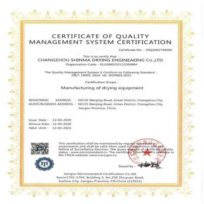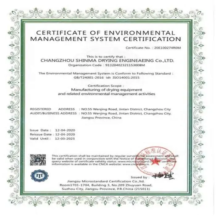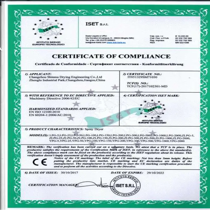 The ZLPG-5 Spray Dryer has certifications including ISO9001, ISO14001, and CE.
