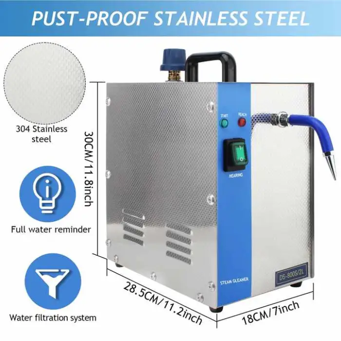 The steam cleaner is constructed from durable 304 stainless steel, providing long-lasting performance.
