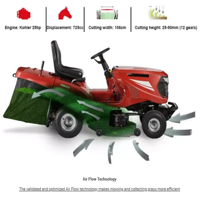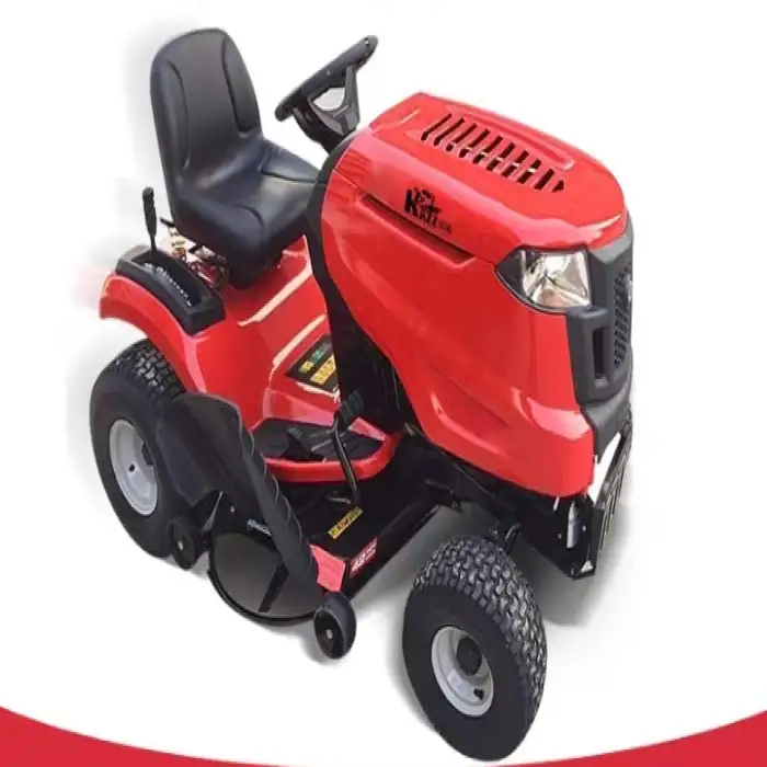 Regular maintenance includes checking engine oil and coolant (if applicable) before each use, cleaning or replacing the air filter periodically, sharpening or replacing blades as needed, checking belts and tire pressure, and servicing per the operator manual. Follow the manufacturer's maintenance schedule for oil-change intervals and other service items.