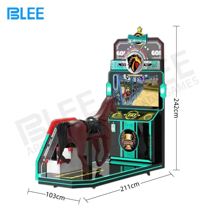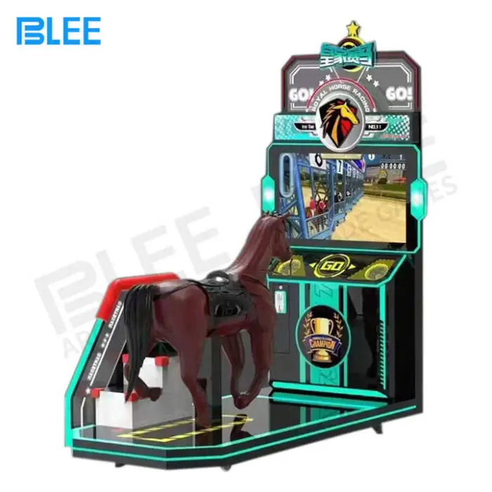 The machine features high-quality graphics and immersive sound effects for a realistic horse racing experience.