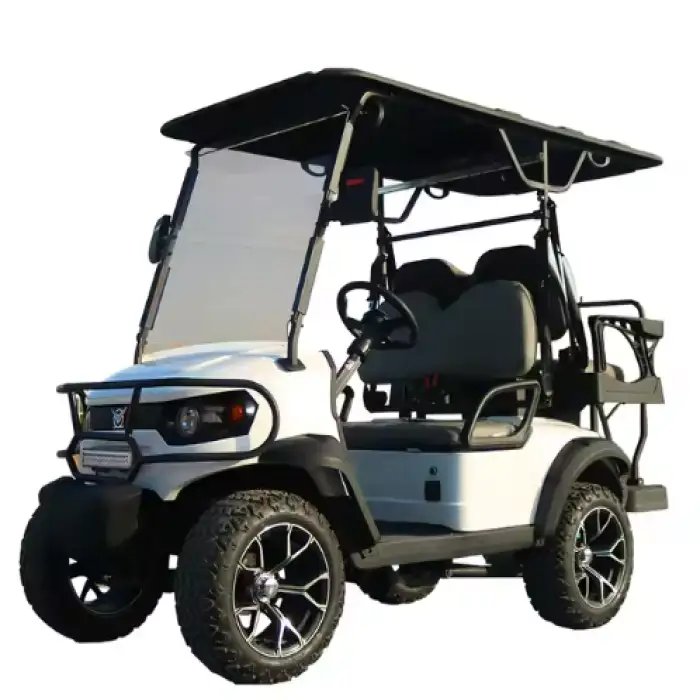 The chassis of the golf cart is made from steel with e-coating and powder coating for durability.