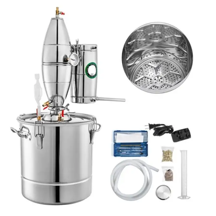 The distiller is constructed from durable 304 stainless steel, ensuring longevity and ease of use.