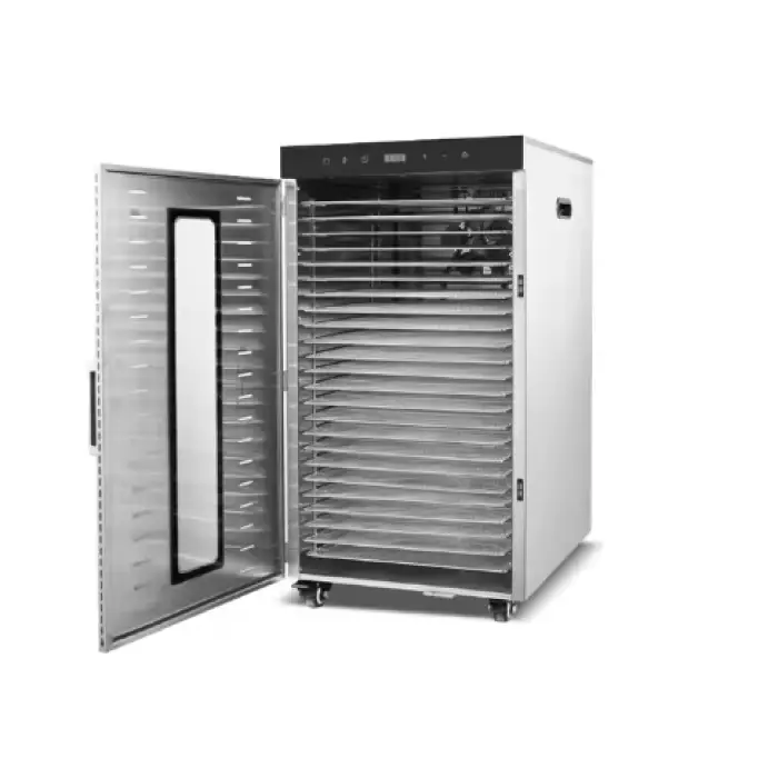 The dehydrator features food-grade 304 stainless steel racks and a housing made from 201 stainless steel, ensuring durability and safety.