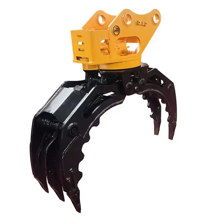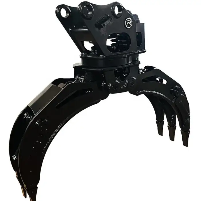 The grapple is designed to handle logs, wood, stone, steel, and other heavy materials efficiently.