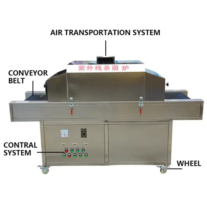 Key features include high-power UV sterilization for effective disinfection, a large conveyor belt for easy movement of items, a compact design for efficient space usage, and robust construction for long-lasting performance.