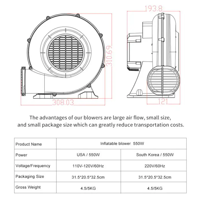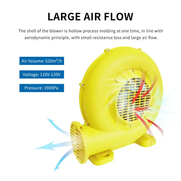 The blower has a flow rate of 520 m³/h, ensuring fast inflation.