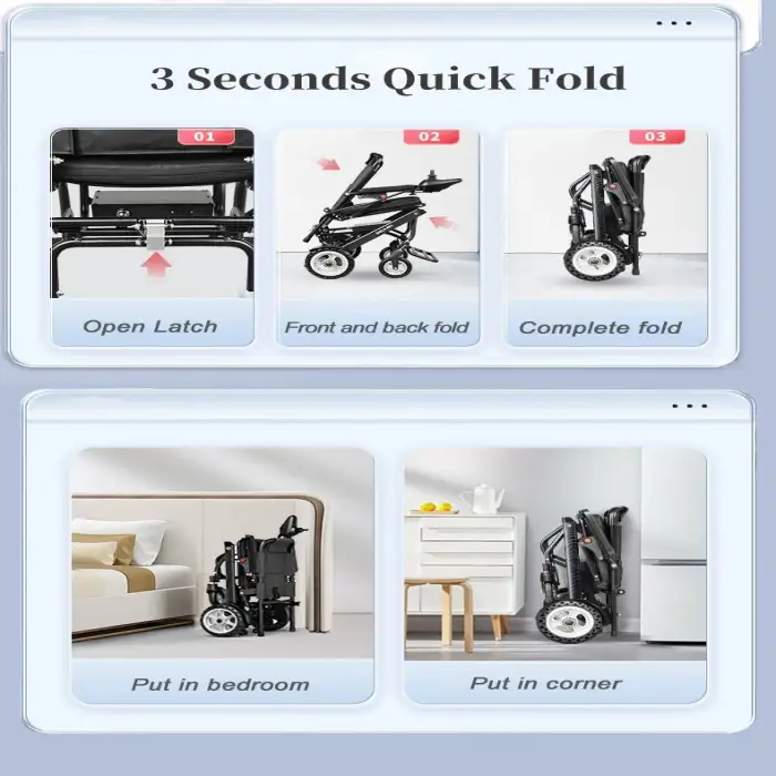 The wheelchair features a simple folding mechanism that allows you to fold it easily for compact storage. Just pull the release lever and fold the wheelchair in half.