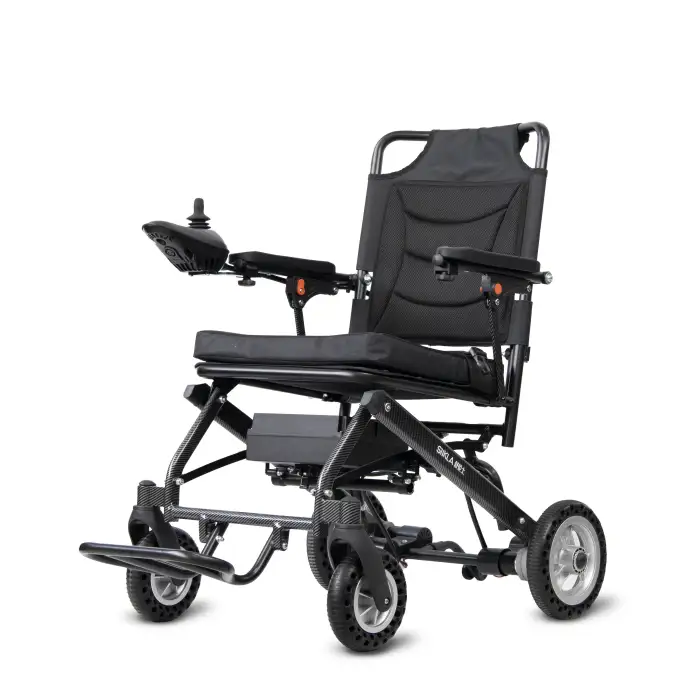 The wheelchair is made from a durable aluminum alloy combined with carbon transfer, ensuring both strength and lightweight properties.