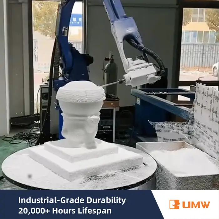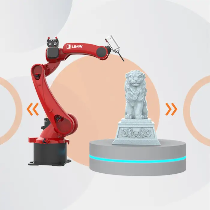 The 6-Axis CNC Robot Engraving Machine can work with metal, wood, stone, plastics, and foam.