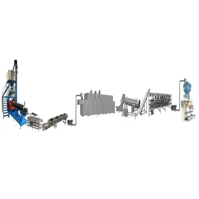 The flow process includes a grinder, mixer, bucket conveyor, twin screw extruder with pre-conditioner, vibrating sifter, high-pressure air conveyor, multi-layer dryer, hoister, oil-sprayer, length single roller flavoring system, cooling machine, and packing machine.