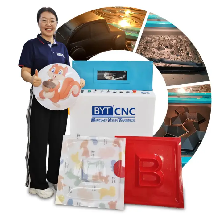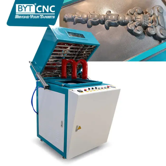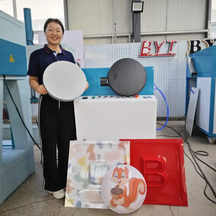The machine can be used for making molds for plastic blister packaging, creating plastic trays, advertising display products, and manufacturing automotive parts.