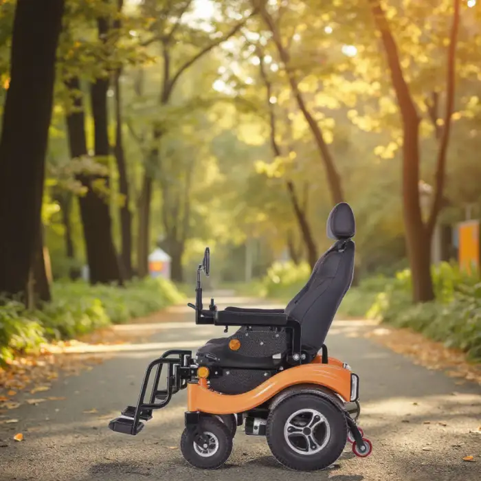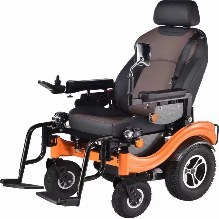 The wheelchair features an automatic control system that allows for easy maneuverability with joystick controls.