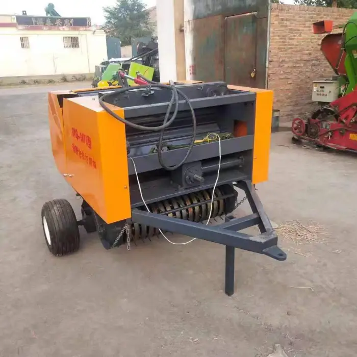 A round baler machine is used to collect and compress hay, straw, and other crops into round bales for easier handling, storage, and transportation.