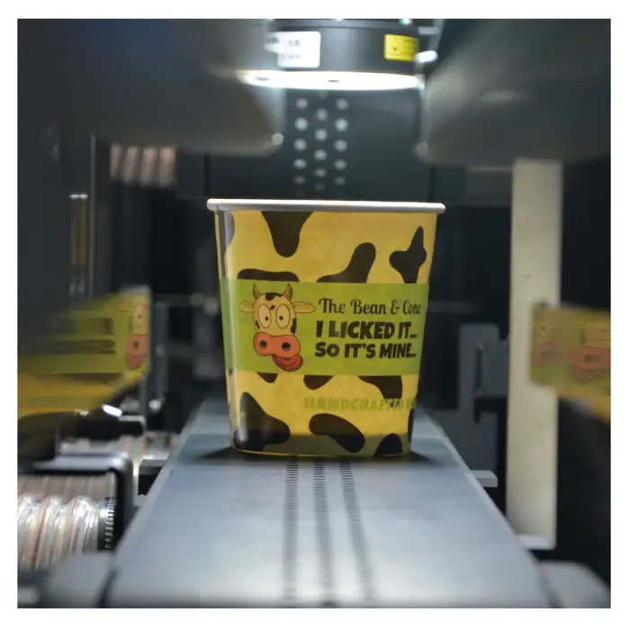 The machine can detect various defects in paper and plastic cups, ensuring that only properly manufactured items are sent to customers.