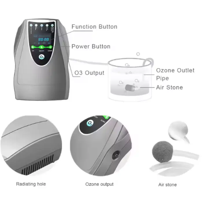 The ozone generator produces ozone, which acts as a powerful oxidizing agent that breaks down contaminants on food surfaces, ensuring they are clean and safe for consumption.