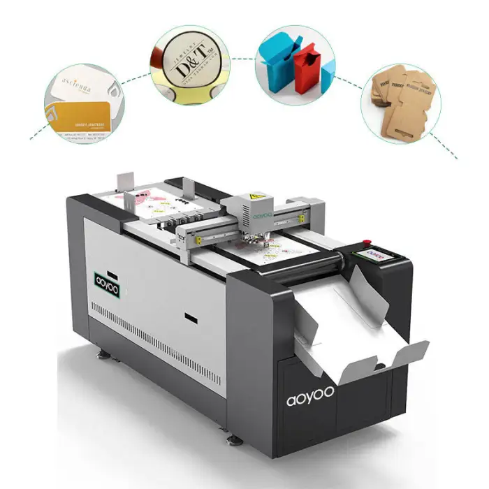 Applications include creating business cards, producing stickers, cutting paper for crafts, manufacturing custom labels, and making corrugated cardboard boxes.