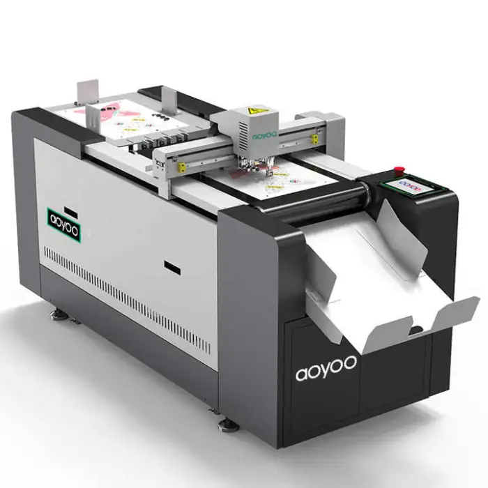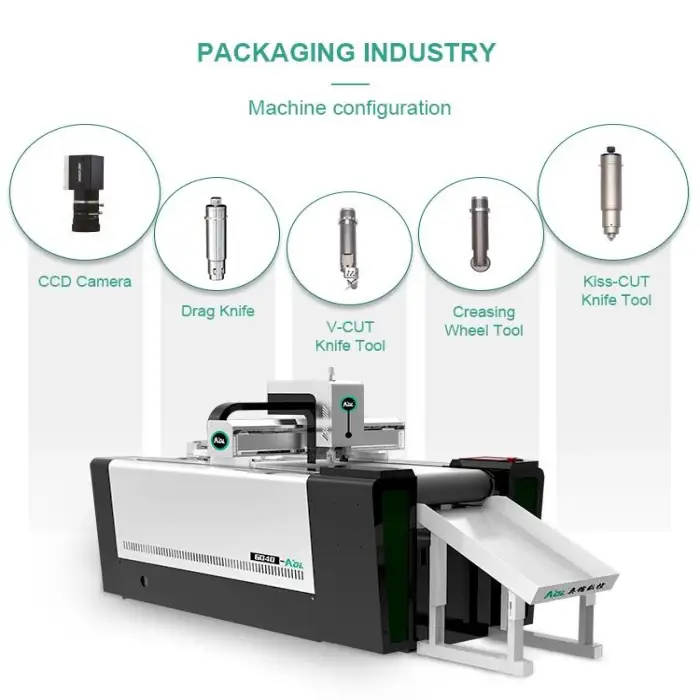 The machine can cut various materials including paper, stickers, labels, and corrugated cardboard.