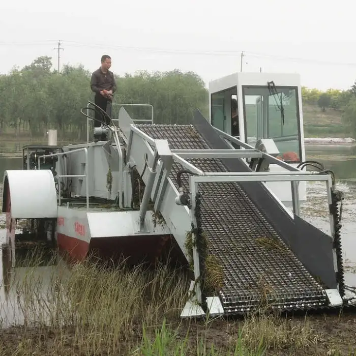 The machine can remove various materials, including weeds, floating plants, and garbage from water bodies.