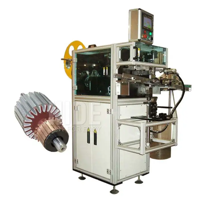 The machine is designed to streamline the process of inserting insulation paper into armature slots, enhancing efficiency and precision in manufacturing setups.