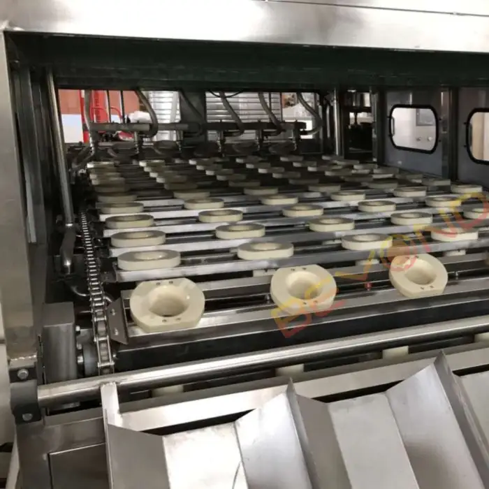 The machine automatically rinses the bottles before filling them with the beverage, ensuring cleanliness and efficiency in the production process.