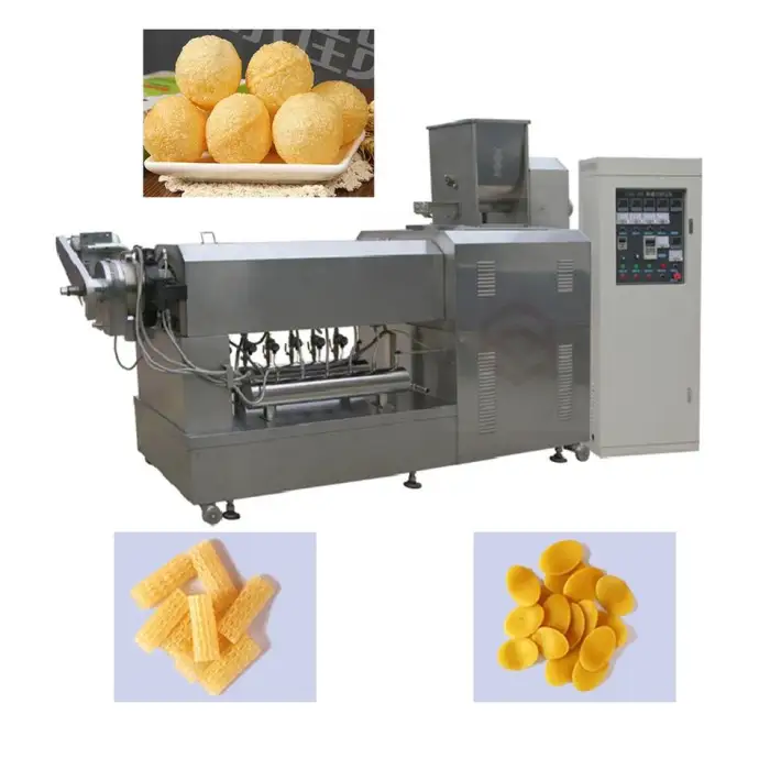 The machine can produce various types of snack food pellets, including both 2D and 3D Pani Puri and other snacks made from wheat flour, potato starch, corn starch, and cassava starch.