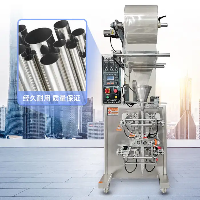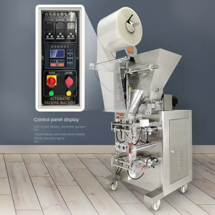 This machine is designed to pack spices, flour, tea, and chemicals, making it suitable for food, beverage, and chemical industries.