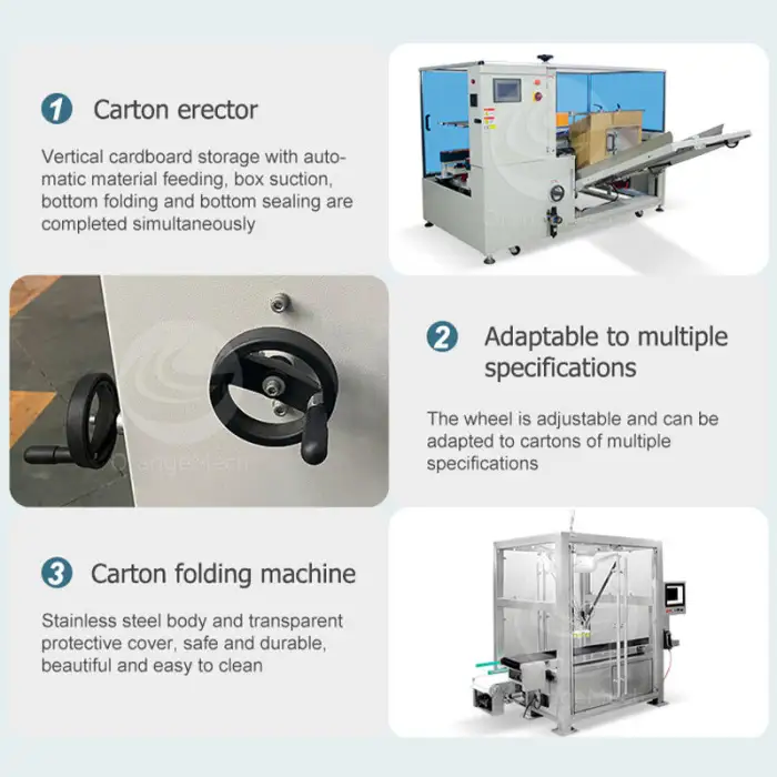 Key features include high efficiency in carton erecting and packing, low noise operation, and suitability for various box types.