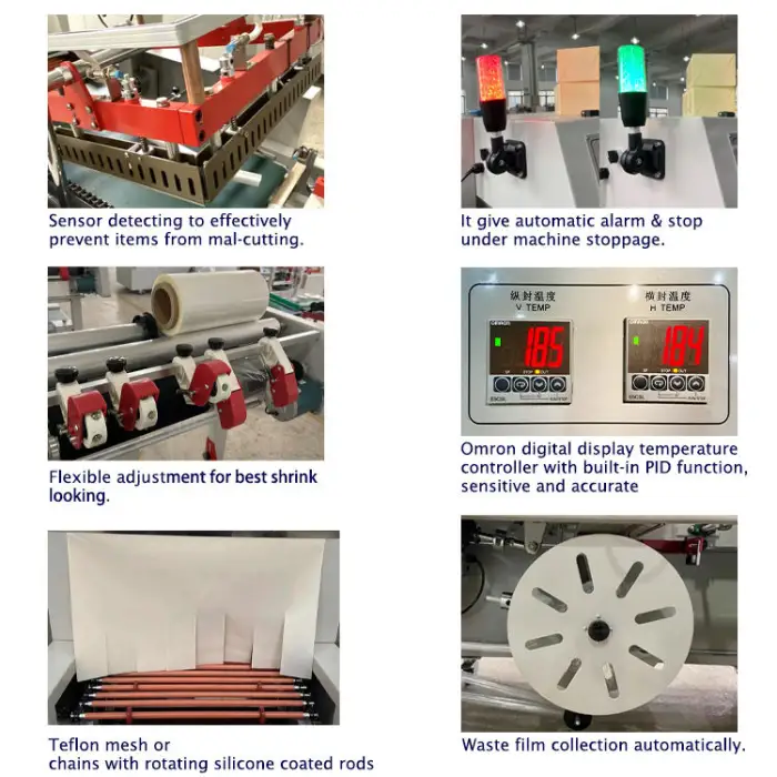 This machine supports various packaging materials, including plastic, POF (polyolefin), and PE (polyethylene).