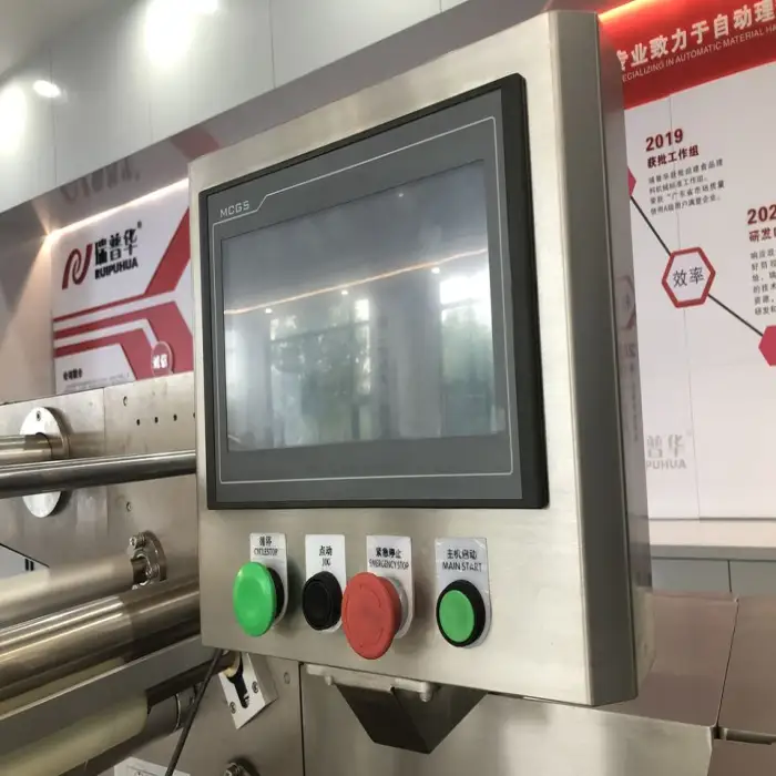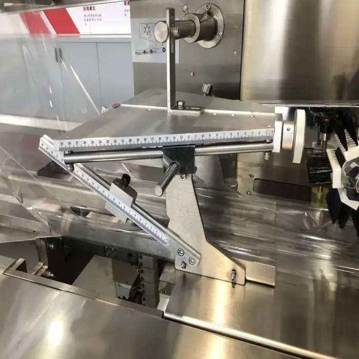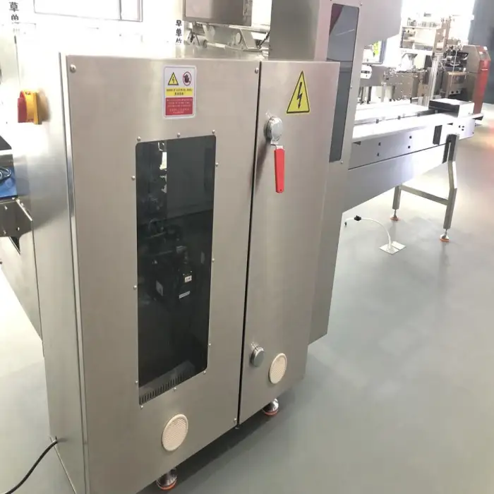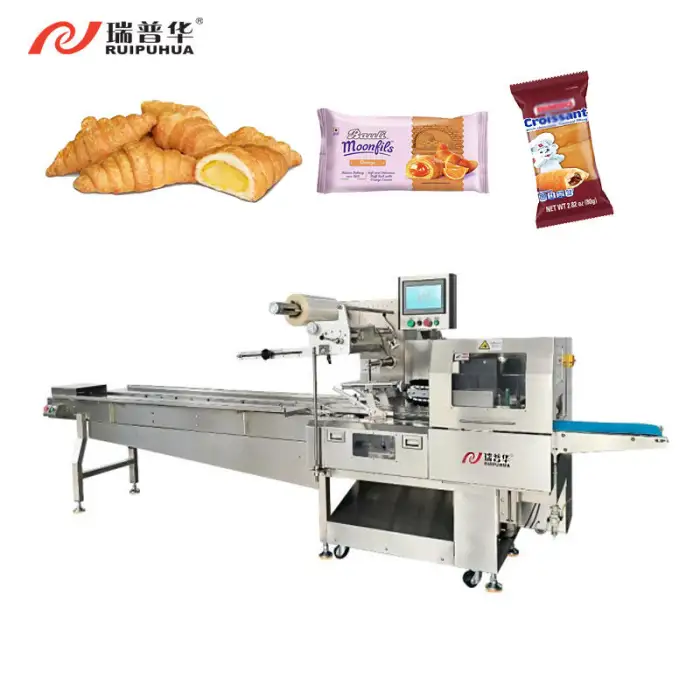 The machine produces pillow-type packaging, commonly used in the food industry for items like croissants and buns.