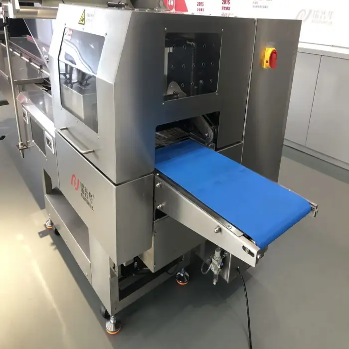 The machine is designed to wrap a variety of food items, including croissants, buns, snacks, and other bakery products.