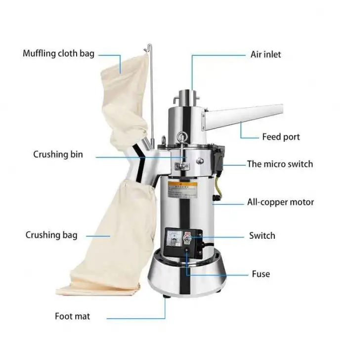 The crushing and grinding components are made of durable SUS304 stainless steel, ensuring longevity and hygiene.
