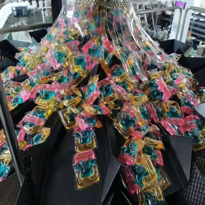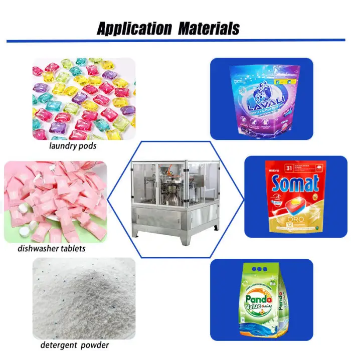 This machine is suitable for packing laundry detergent pods, household cleaning products, food items, chemical products, textiles, and hardware items.