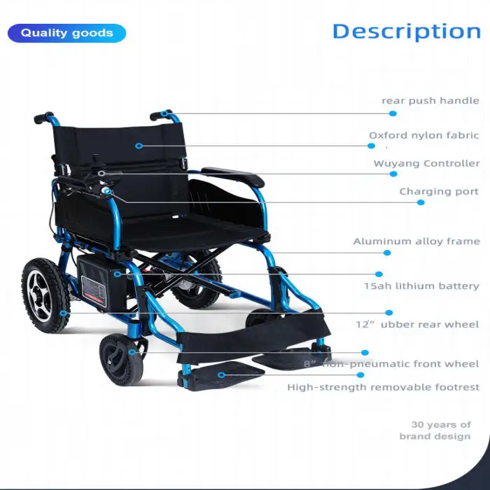 The wheelchair is suitable for various terrains, including pavement, grass, and gravel, thanks to its powerful motor.
