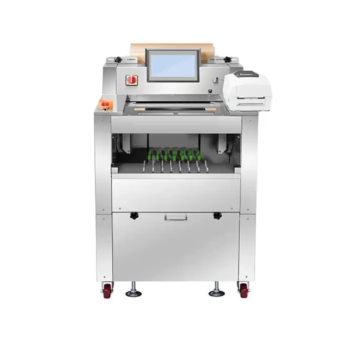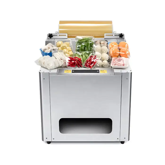 This machine is designed to package fresh fruits like tomatoes and cherries, vegetables, and meats, ensuring they are securely wrapped for freshness and safety.