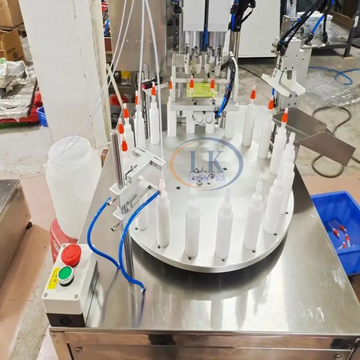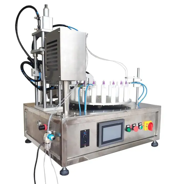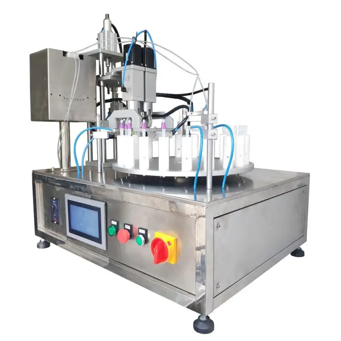 The Automatic High Speed Turntable Reagent Ceramic Small Bottle Plunger Pump Filling Capping Machine can fill up to 2400 bottles per hour.