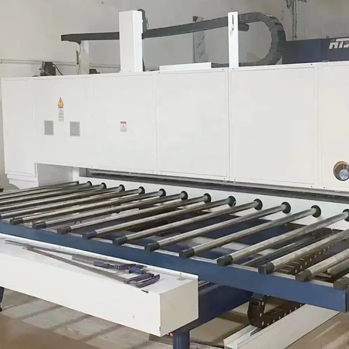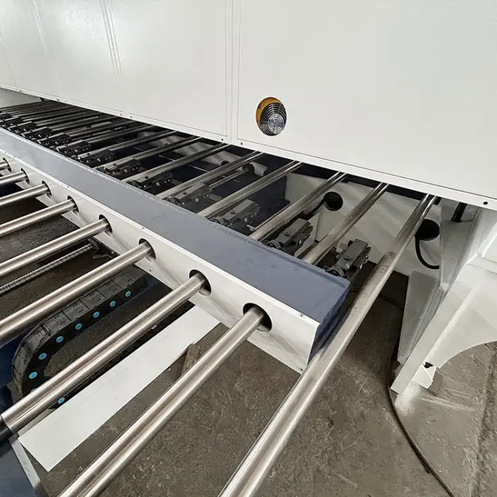 The machine is equipped with several safety features, including emergency stop buttons and protective covers to ensure safe operation.