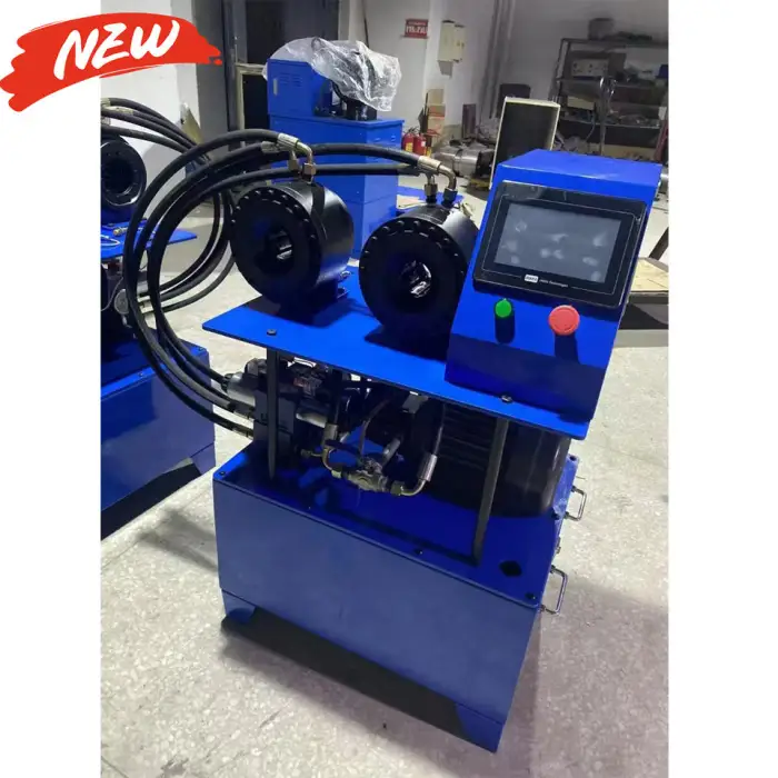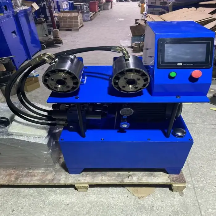 The machine is designed for pressing bathroom pipes, connecting flexible shafts, and manufacturing hydraulic hoses.