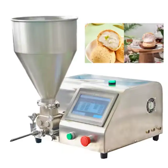 The machine can handle various fillings such as jam, cream, chocolate paste, and other soft or semi-liquid ingredients.