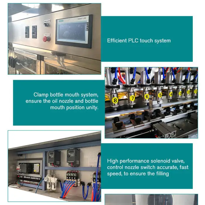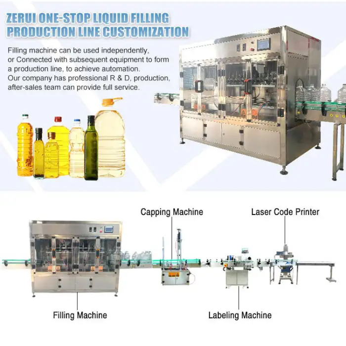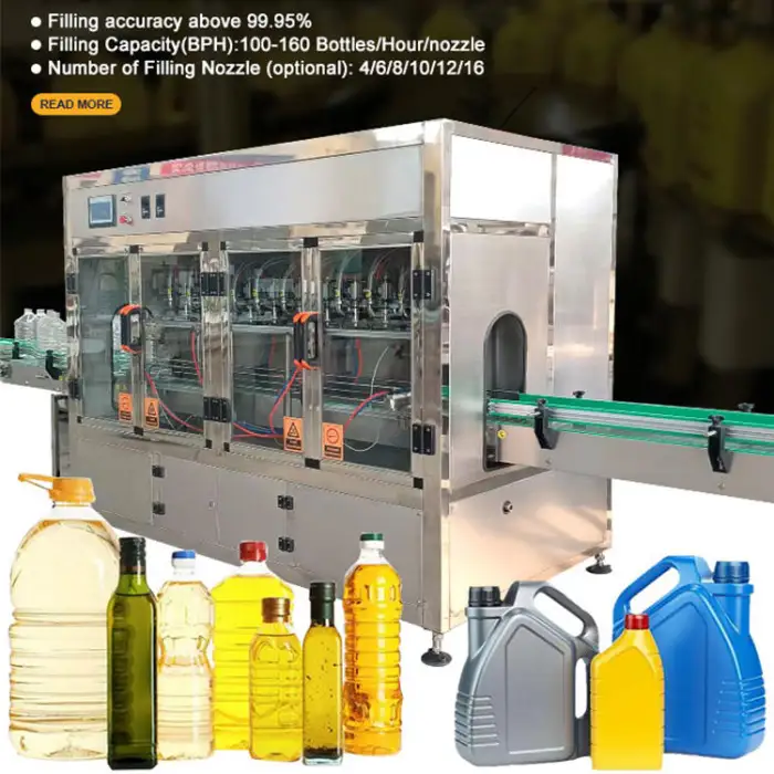 The Automatic Multifunctional 2-12 Nozzles Flow Meter Filling Machine can handle various liquids, including oils, juices, and chemical products.