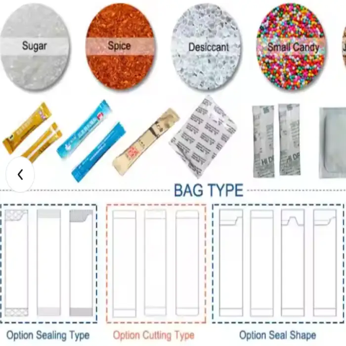 The machine is compatible with various bag types, including pillow bags, pin bags, chain bags, and hole bags.