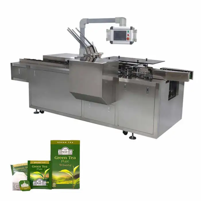 This machine is versatile and can package various products including tea bags, toothpaste, cosmetics, biscuits, candy, and coffee bars.